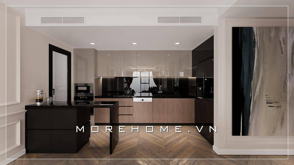 Hệ thống bếp được thiết kế với chất liệu gỗ công nghiệp thiết kế hiện đại và tiện nghi