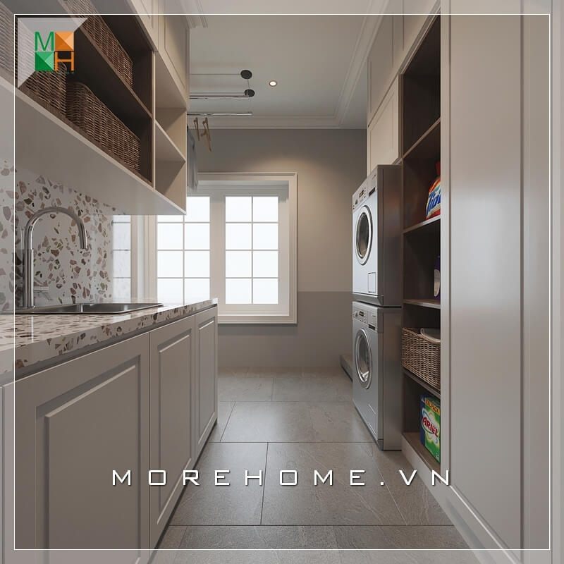 Sẽ là một gợi ý sáng tạo sẽ khiến bạn thích thú như trong ý tưởng bố trí không gian bếp hiện đại biệt thự Vinhomes Imperia Hải Phòng trong đây, thiết kế kệ trang trí ở vị trí gần bàn ăn nhất giúp bạn lấy ly, chén một cách thuận tiện.