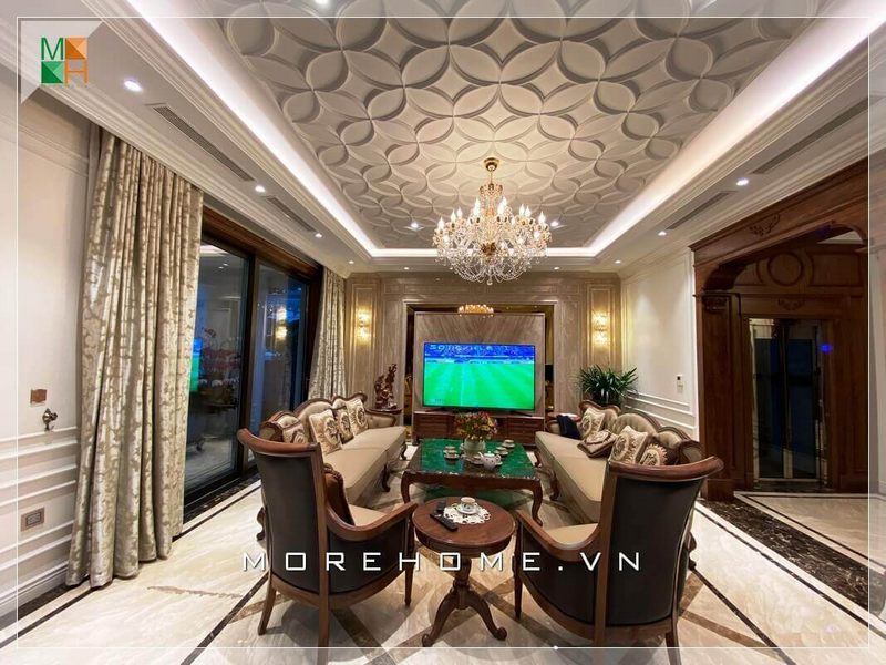 Có lẽ điểm nổi bật nhất của căn phòng khách chính là bộ bàn ghế sofa khung gỗ tự nhiên đẹp, sang trọng. Với những đường nét uốn lượn mềm mại đã giúp cho căn phòng trở nên uyển chuyển, dịu dàng và quý phái hơn.