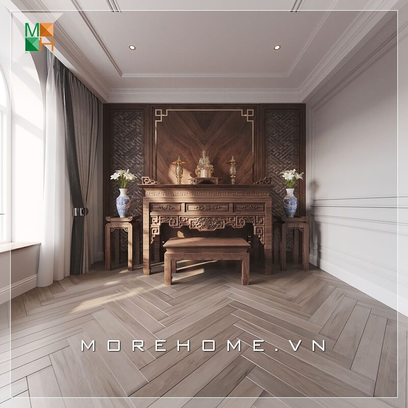 Lựa chọn nội thất gỗ óc chó cho phòng thờ của biệt thự mang màu nâu trầm ấm và sự đặc biệt của không gian linh thiêng.