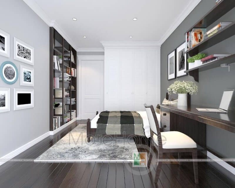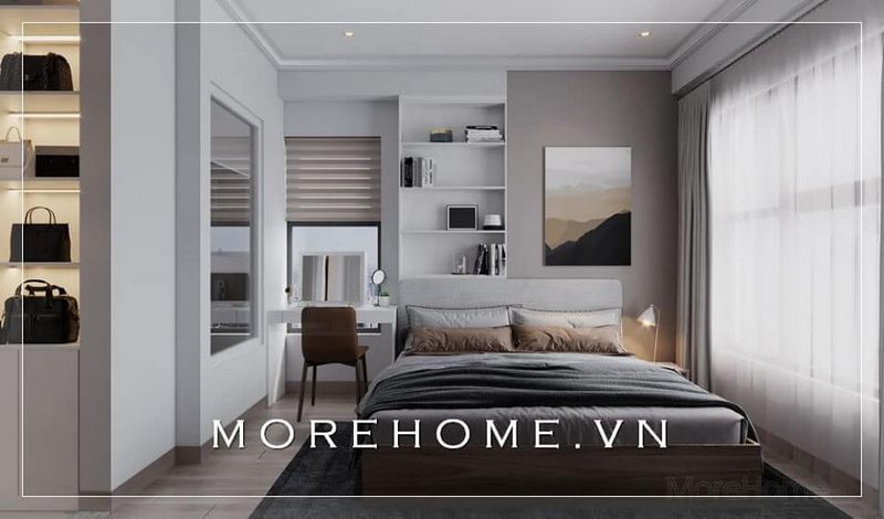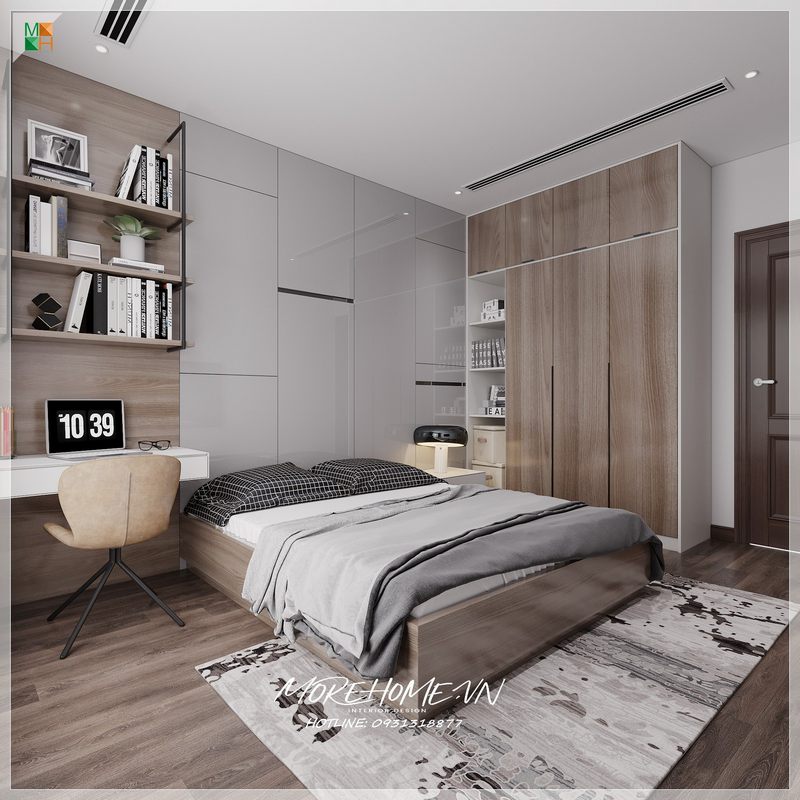 Giường ngủ liền bàn làm việc tông màu nâu trầm phong cách hiện đại, sử dụng ánh sáng tự nhiên nhờ thiết kế cửa sổ lớn bằng kính cường lực, giúp không gian căn phòng được mở rộng hơn