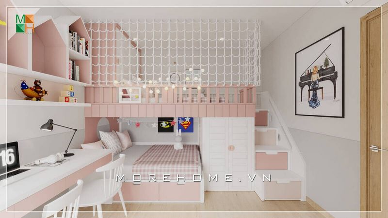 Mẫu thiết kế giường ngủ 2 tầng hiện đại, công năng rất tiện lợi cho bé. Sử dụng 2 tone màu chủ đạo là hồng và trắng rất dễ thương.