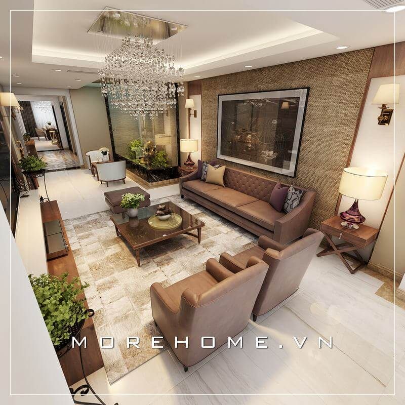 Thêm phần ấn tượng cho phòng khách chung cư nhờ sự kết hợp hoàn hảo giữa sofa văng bọc da cao cấp với ghế sofa đơn màu xanh nổi bật được thiết kế theo phong cách tân cổ điển đầy nghệ thuật.