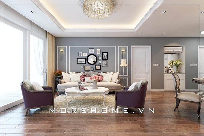 Phòng khách biệt thự, nhà phố thu hút với tâm điểm là thiết kế sofa phong cách tân cổ điển ấm cúng gần gũi với vỏ bọc vải êm ái đầy tinh tế.