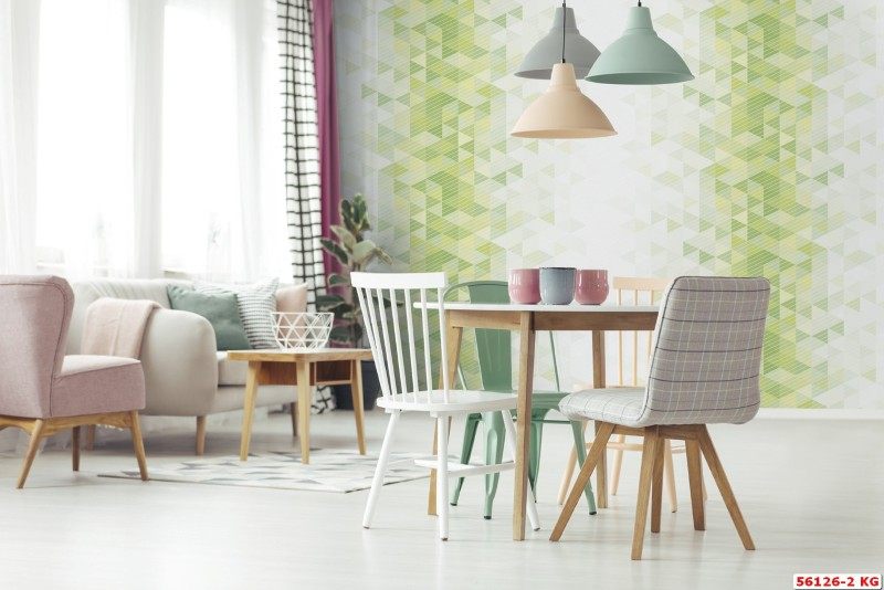 Một phong cách mới mẻ, tươi mát, hiện đại với sự kết hợp của 2 mẫu giấy dán tường 3831-1 và 3807-3.
