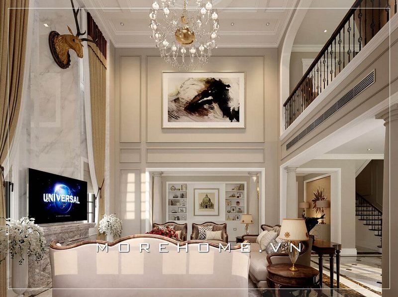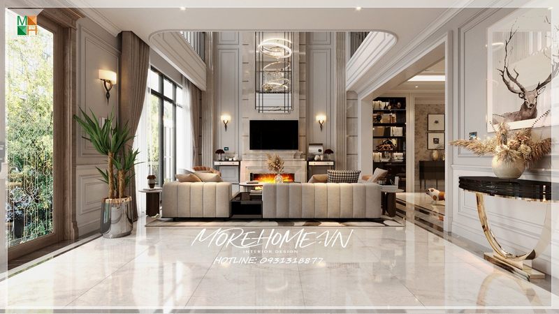 Mẫu thiết kế phòng khách chung cư, nhà phố, biệt thự tân cố điển đẳng cấp sang trọng với lối thiết kế rộng rãi có cửa sổ lớn thông thoáng, đón ánh sáng tự nhiên vào phòng.