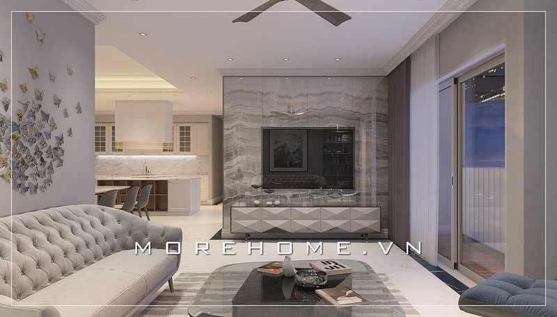 Nhờ vào trang trí cao cấp các kiến trúc sư Morehome đã tạo nên các mặt tường đá viền mây tạo cho không gian phòng khách chung cư mới mẻ hiện đại, không có cảm giác nhàm chán.