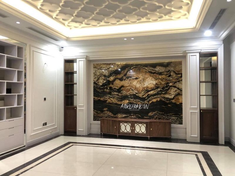Hình ảnh thi công đá ốp vách tivi phòng khách do Morehome cung cấp lắp đặt