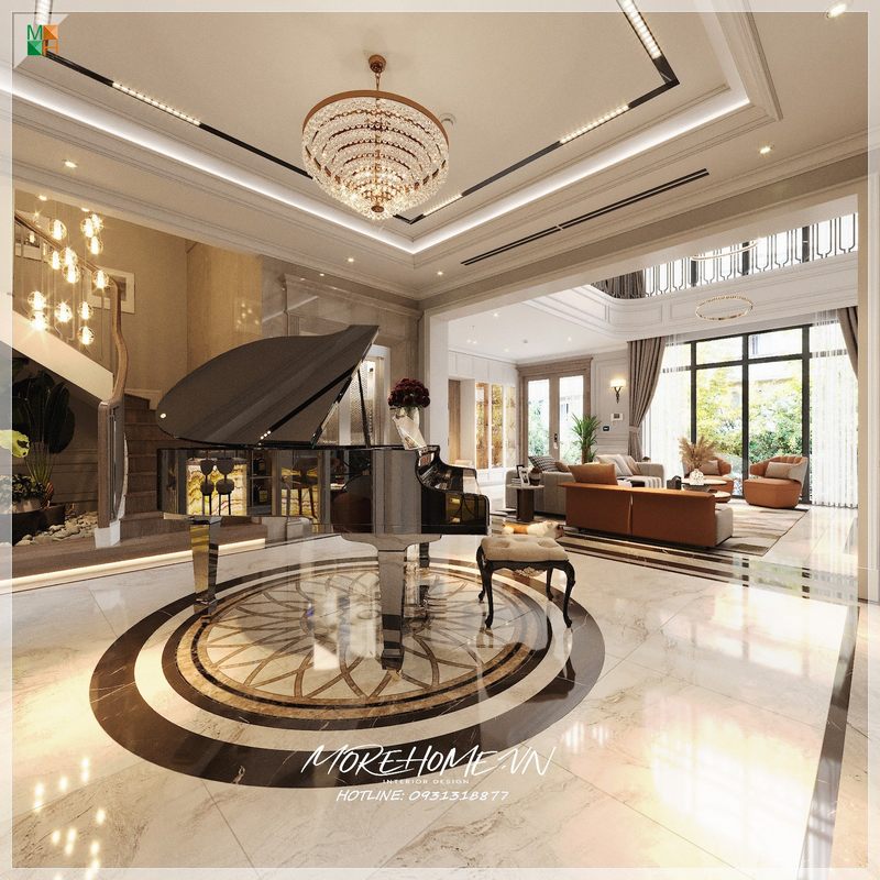 Đàn piano được đặt ở vị trí trung tâm có tác dụng làm điểm nhấn chính giúp không gian căn phòng thêm rộng và sang trọng hơn. Không gian kết hợp với tông màu trung tính giúp căn phòng khách tăng tính thẩm mỹ.