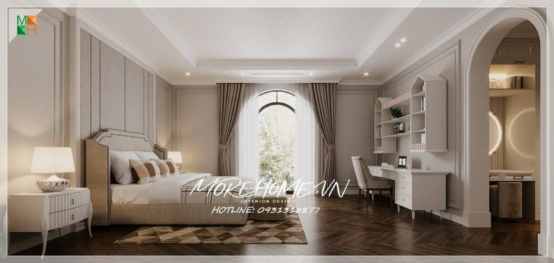 Phòng ngủ master được thiết kế với nội thất gỗ tự nhiên sơn trắng theo phong cách tân cổ điển nhẹ nhàng.